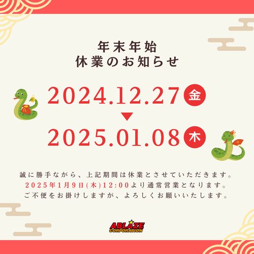 平素よりアブレイズコーポレーションをご利用いただき、心より感謝申し上げます。本年も多くの皆様にお問い合わせいただき、厚く御礼申し上げます。 弊社では、誠に勝手ながら、下記の期間を年末年始休業とさせていただきます。 《年末年始休業期間》 2024年…