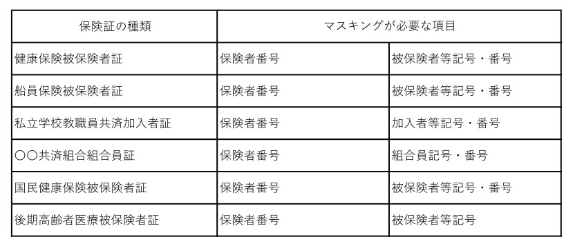 健康保険証にも職業などによって様々な種類がありますが、マスキングをする必要がある部分は以下のとおりです。